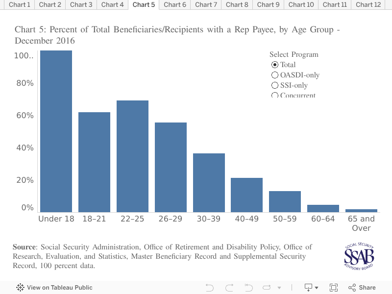 - Chart 5: Percent of Beneficiaries and Recipients with a Rep Payee, by Age Group and Program – December 2016